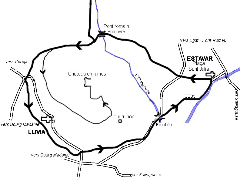 Après avoir traversé le petit pont sur l’Estagouge (ruisseau) qui sert de frontière, prenez à gauche direction Llivia.